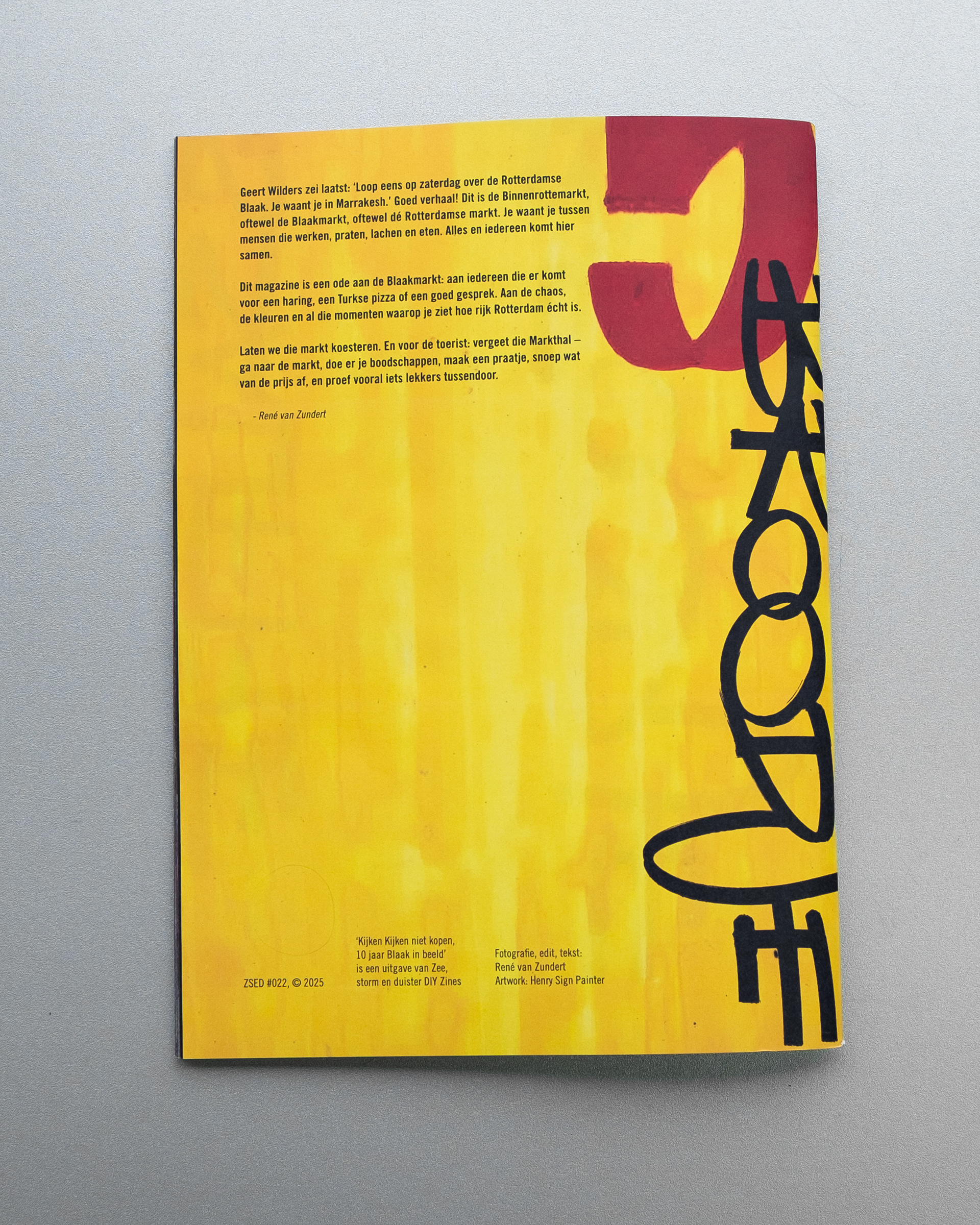 Geert Wilders zei laatst: ‘Loop eens op zaterdag over de Rotterdamse Blaak. Je waant je in Marrakesh.’ Goed verhaal! Dit is de Binnenrottemarkt, oftewel de Blaakmarkt, oftewel dé Rotterdamse markt. Je waant je tussen mensen die werken, praten, lachen en eten. Alles en iedereen komt hier samen. Dit magazine is een ode aan de Blaakmarkt: aan iedereen die er komt voor een haring, een Turkse pizza of een goed gesprek. Aan de chaos, de kleuren en al die momenten waarop je ziet hoe rijk Rotterdam écht is. Laten we die markt koesteren. En voor de toerist: vergeet die Markthal — ga naar de markt, doe er je boodschappen, maak een praatje, snoep wat van de prijs af, en proef vooral iets lekkers tussendoor. November 2025, Fotografie, edit en tekst: René van Zundert Voor-en achterkant: Henry Sign painter 64 pagina's op 120 grams gerecyceld papier, A4